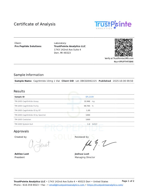 Cagrilintide is a long-acting synthetic peptide designed as a dual agonist for amylin and calcitonin receptors (DACRA), derived from human amylin and modified with a fatty acid chain to prolong its activity. It is currently studied in laboratory models for its effects on appetite control, energy balance, and metabolic function. Research highlights its role in suppressing food intake and slowing gastric emptying without directly indicating human therapeutic use.