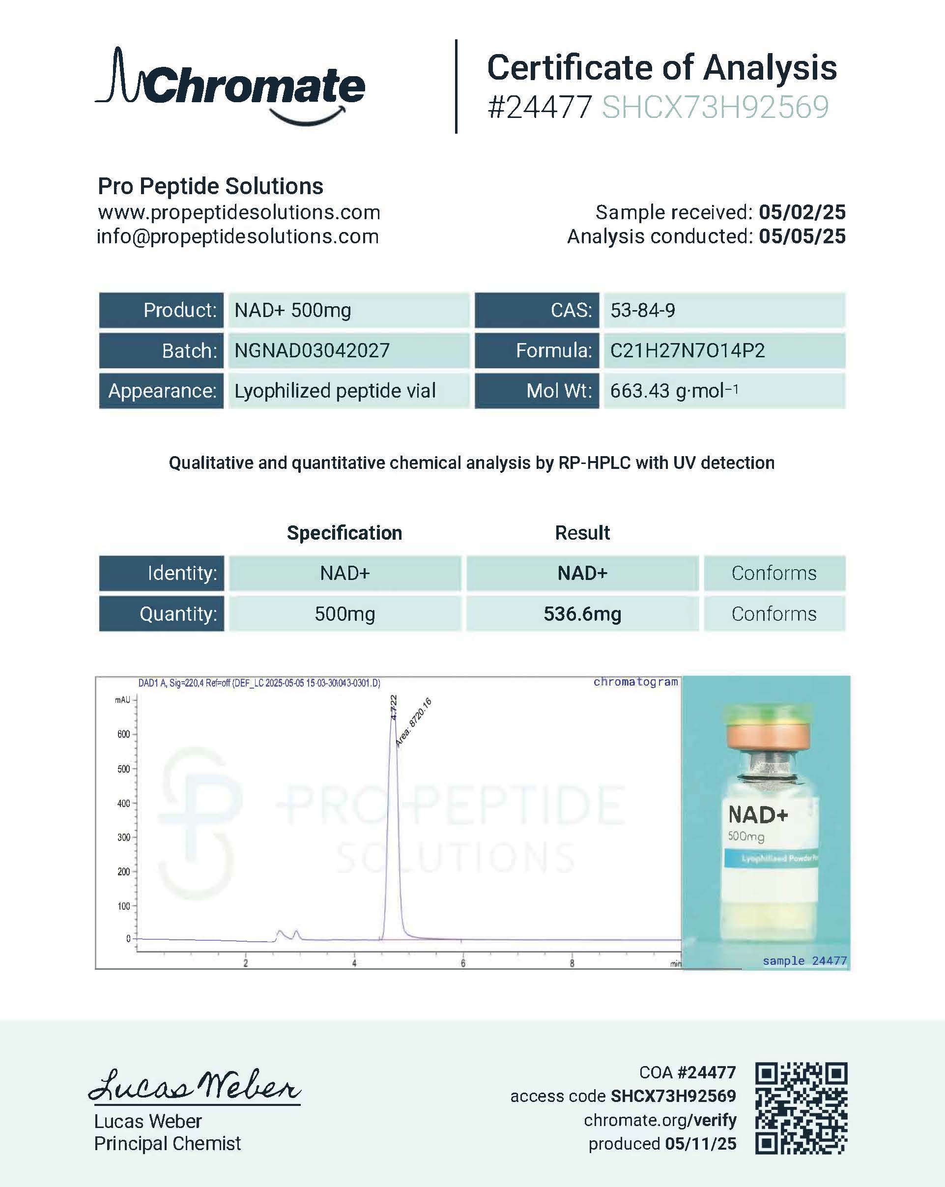 NAD+ (500mg) is an essential coenzyme found in virtually all living cells, recognized for its critical role in various metabolic and cellular processes. Originally highlighted for its involvement in energy production, NAD+ has demonstrated compelling outcomes in numerous research studies, particularly those examining healthy aging, mitochondrial function, and DNA repair. Researchers have delved into how NAD+ levels may influence cell vitality, focusing on its potential to promote resilience against age-related decline. Notably, NAD+ has been investigated for its capacity to support enzymatic systems—such as sirtuins—that regulate metabolic pathways and stress responses, reinforcing the molecule’s importance in fundamental biological processes.